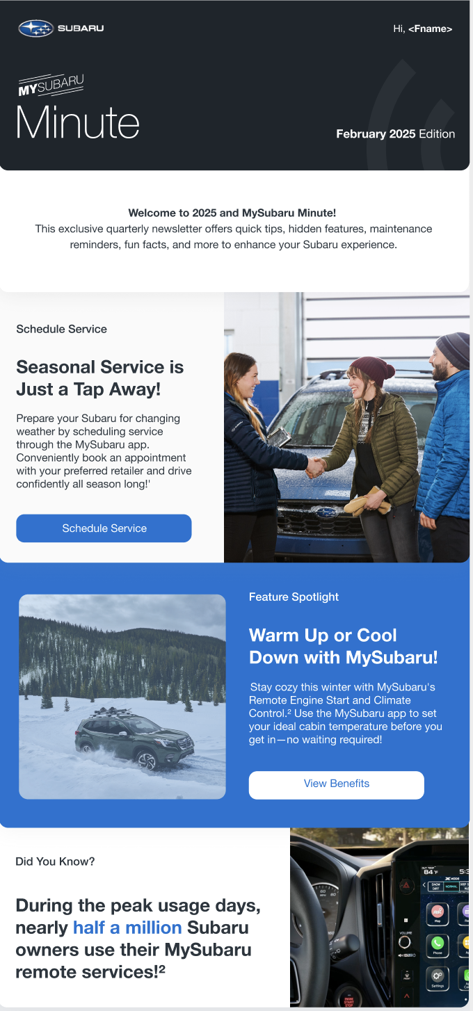 MySubaru members receive updates and newsletters that highlight the features included in their membership, showcasing what their vehicle is capable of.